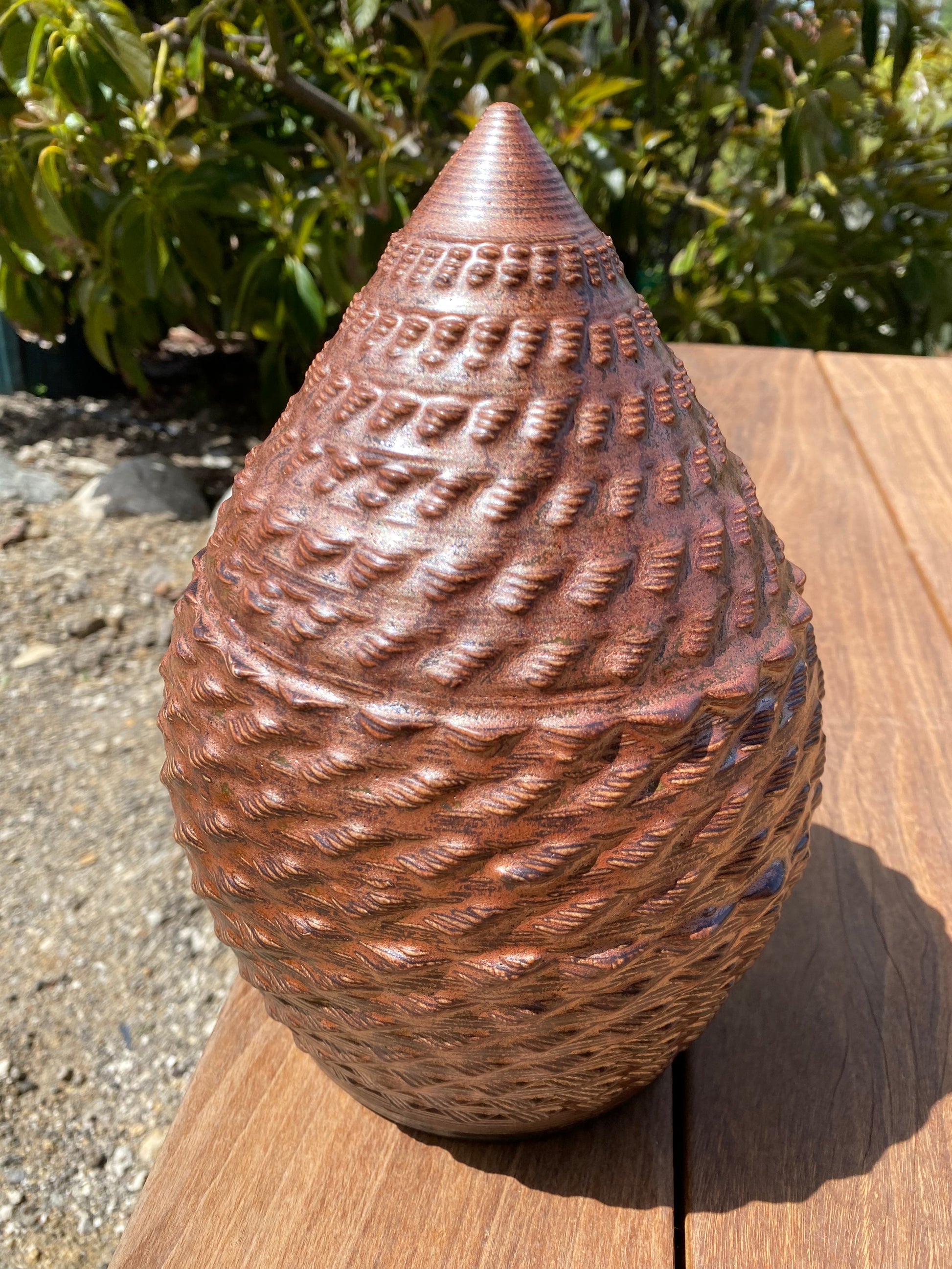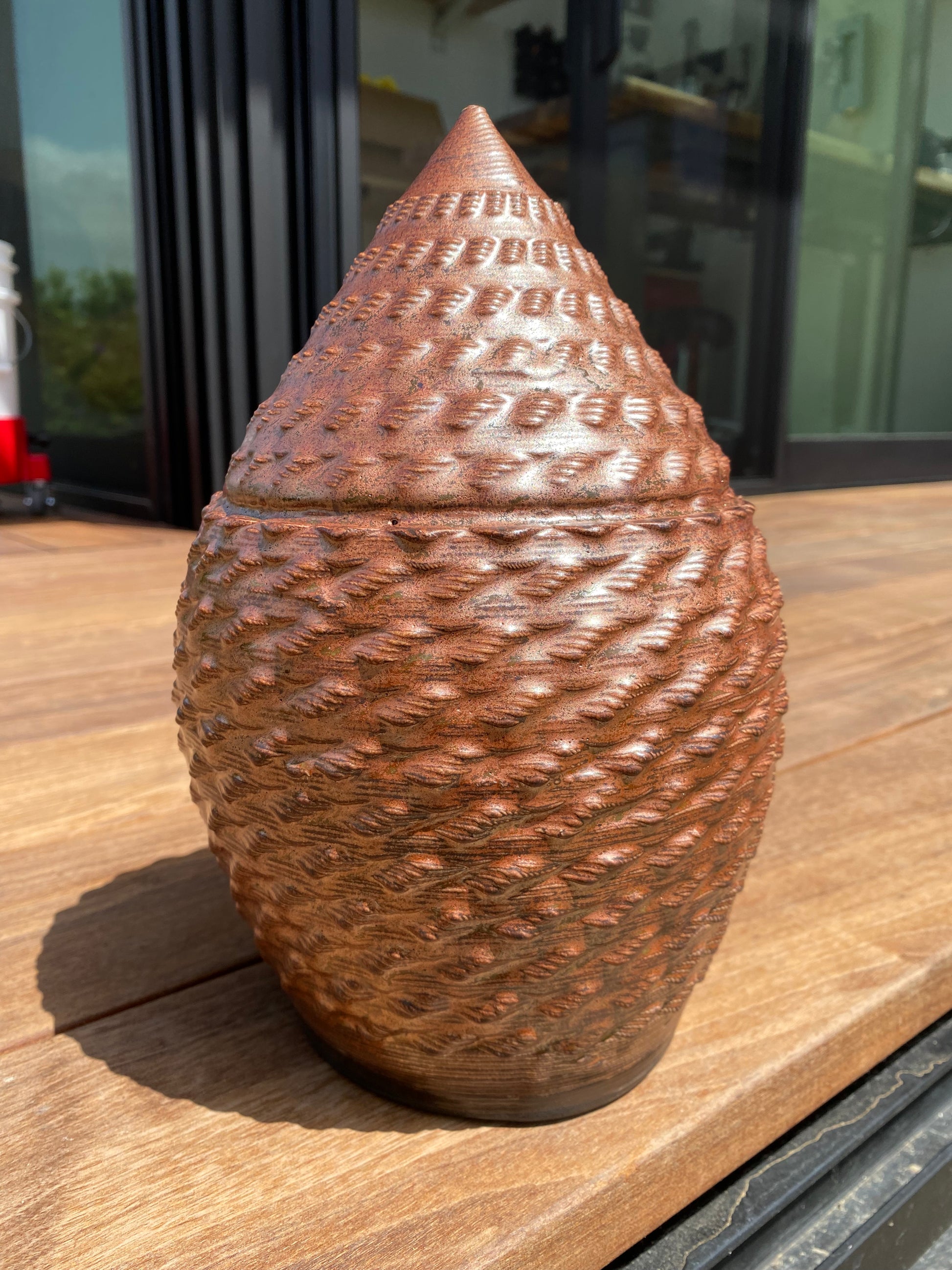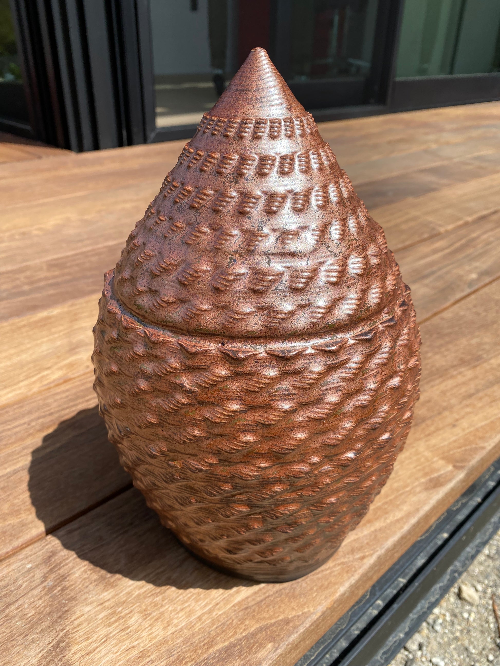 - The profound flux and "glass in motion" created by the ceramic firing process takes rich, layered glazes and manifests a metallic copper shell.