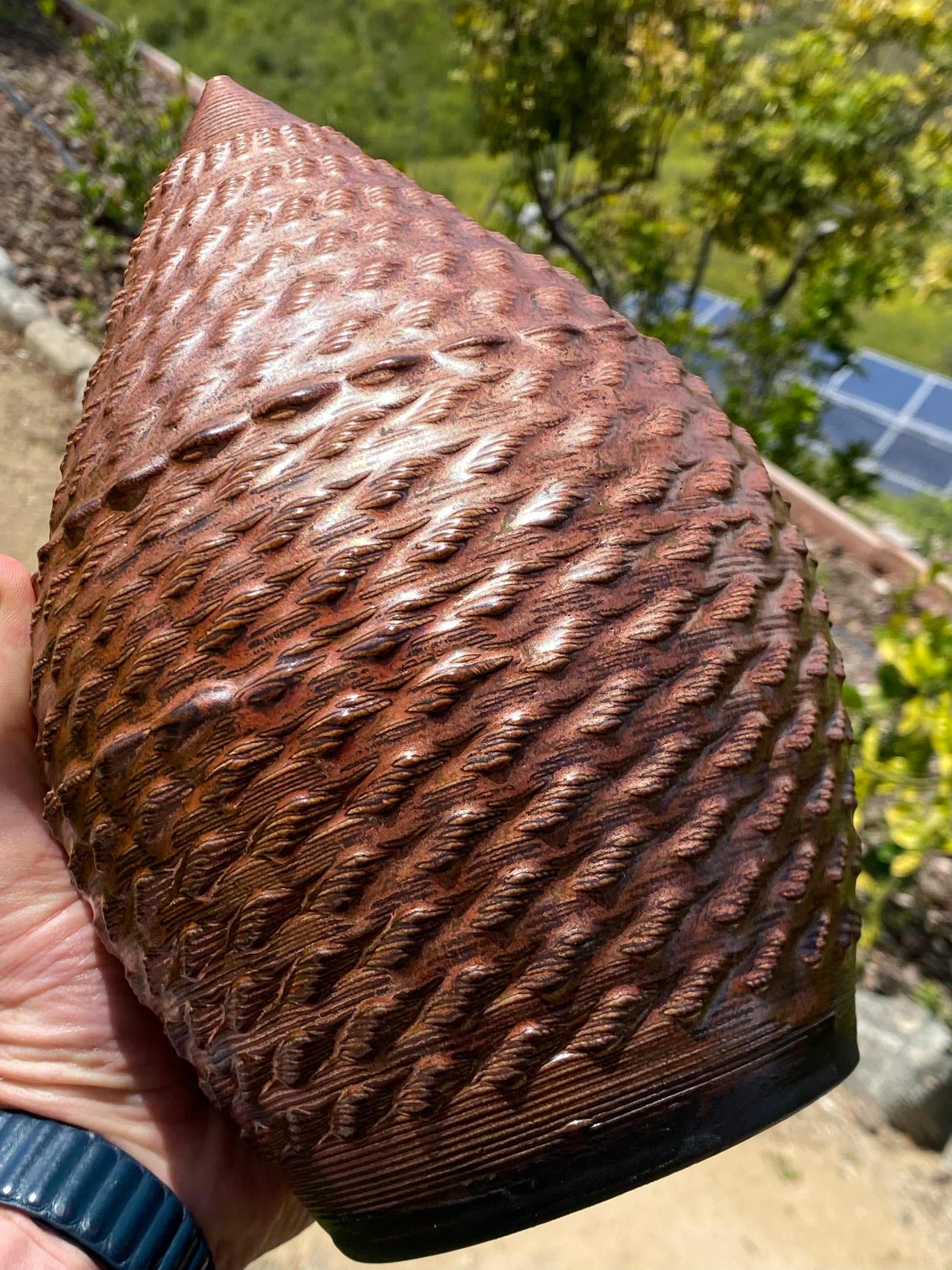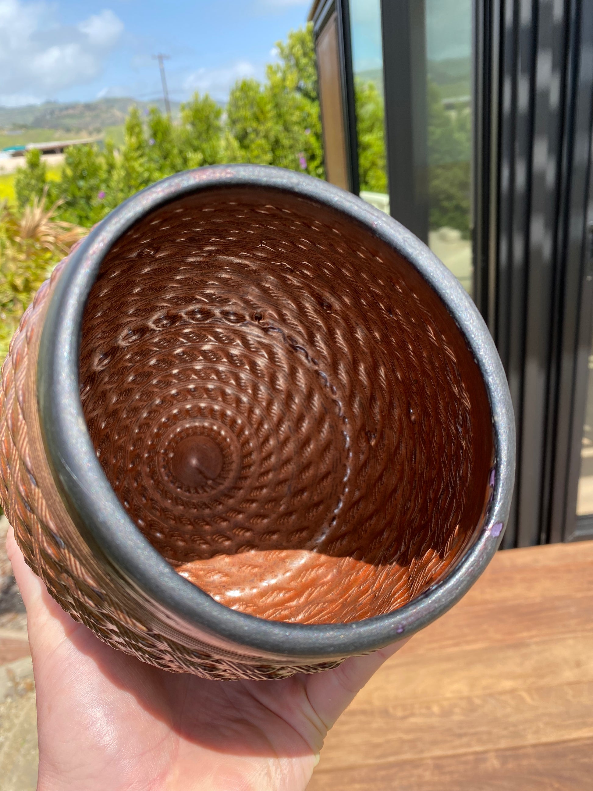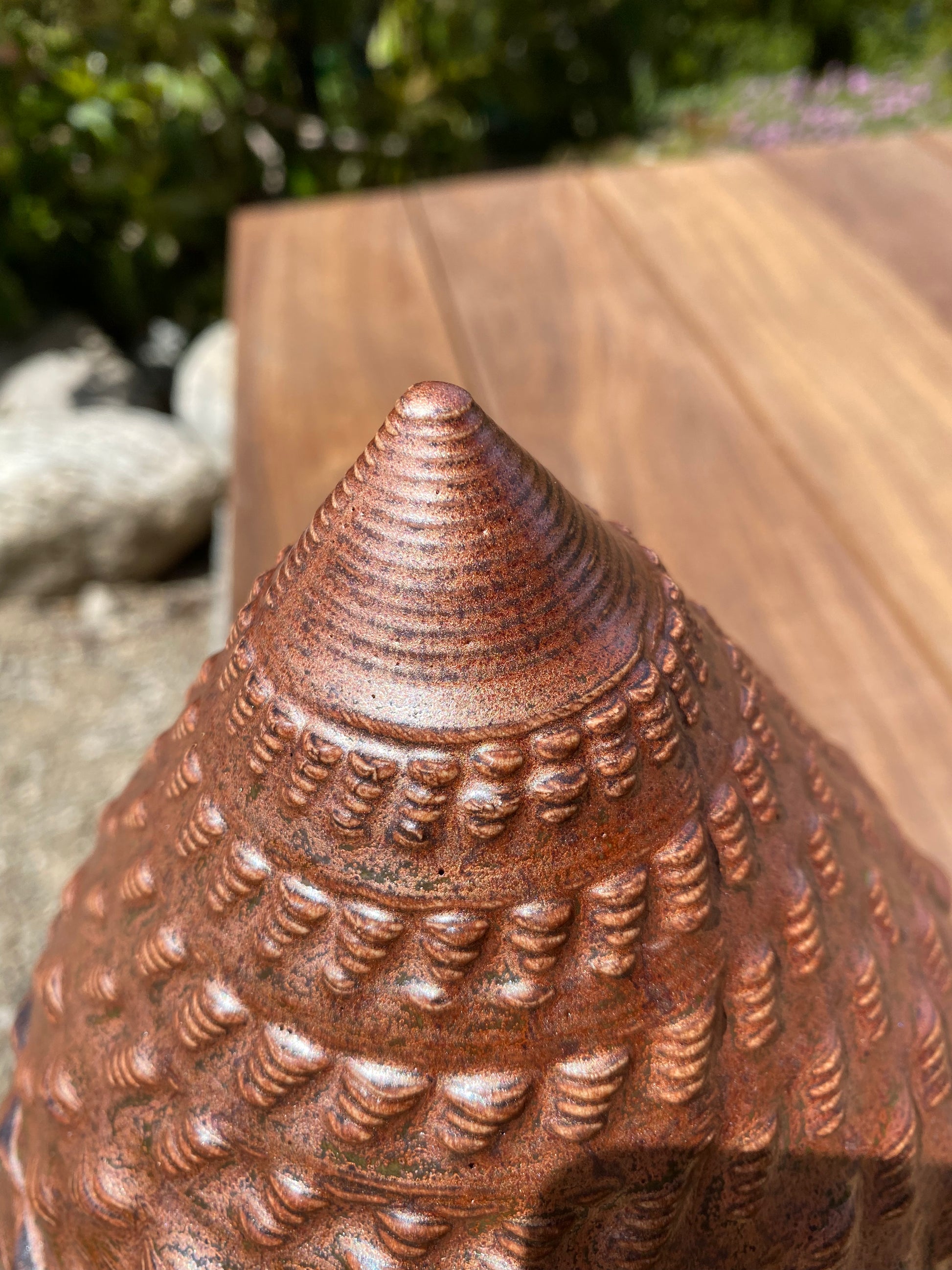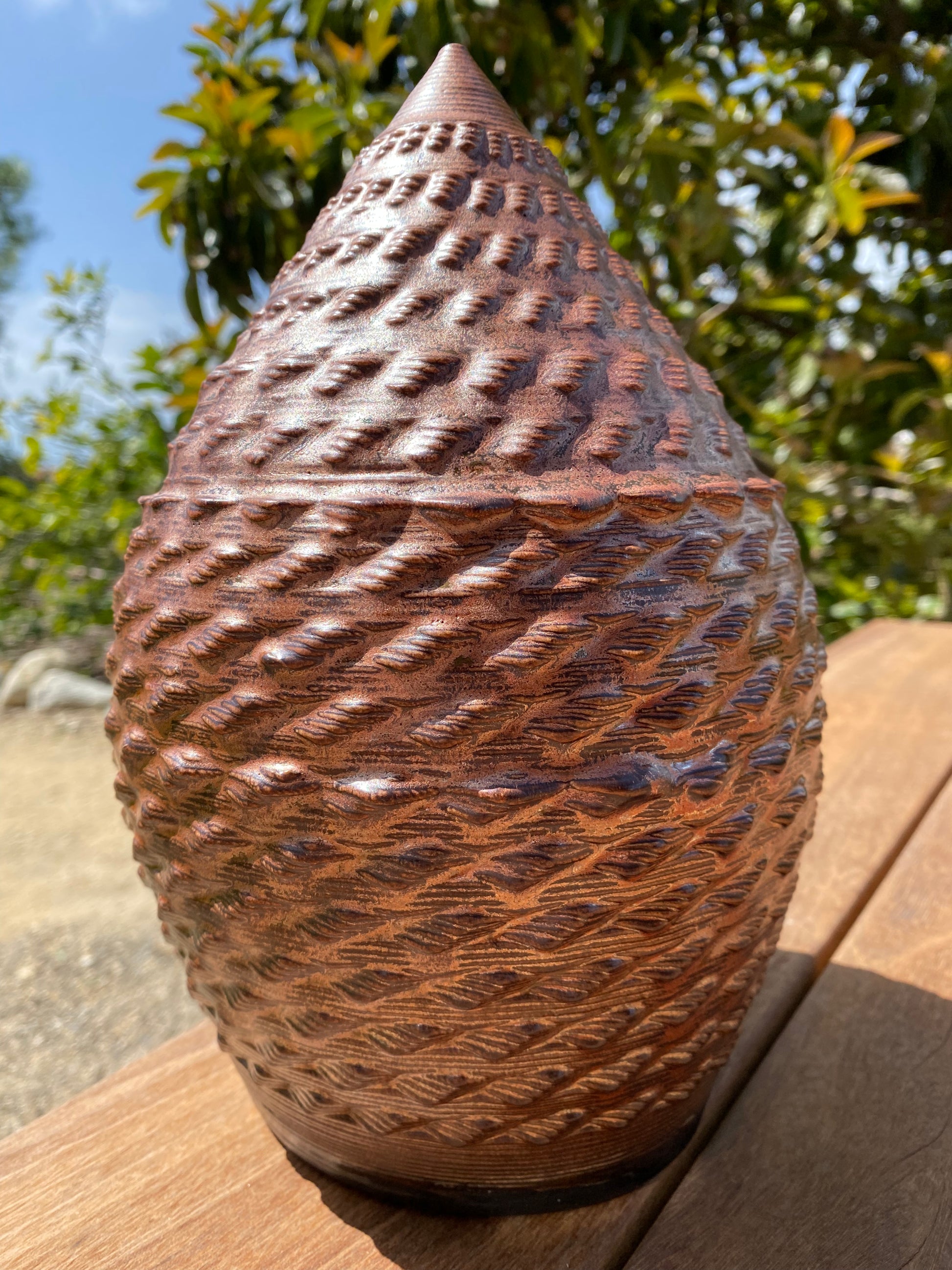 - The profound flux and "glass in motion" created by the ceramic firing process takes rich, layered glazes and manifests a metallic copper shell.